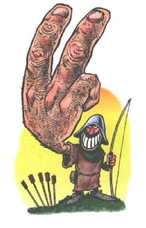 A popular legend narrates that after the Battle of Agincourt (1415) where 6,000 Englishman thanks to the incredible power of the newly deployed longbowmen won against 36,000 Frenchman men-at-arm and Knights. The French embarrassed and outraged commanded to cut the main index and middle finger used to draw a bow to every Englishman and Welshman they found. It actually takes three fingers to effectively draw a longbow and it appears that eventually the order was changed to three fingers. When the longbowmen found out they started taunting their two fingers in defiance to the French, showing them that they could still draw a bow and kill them.
